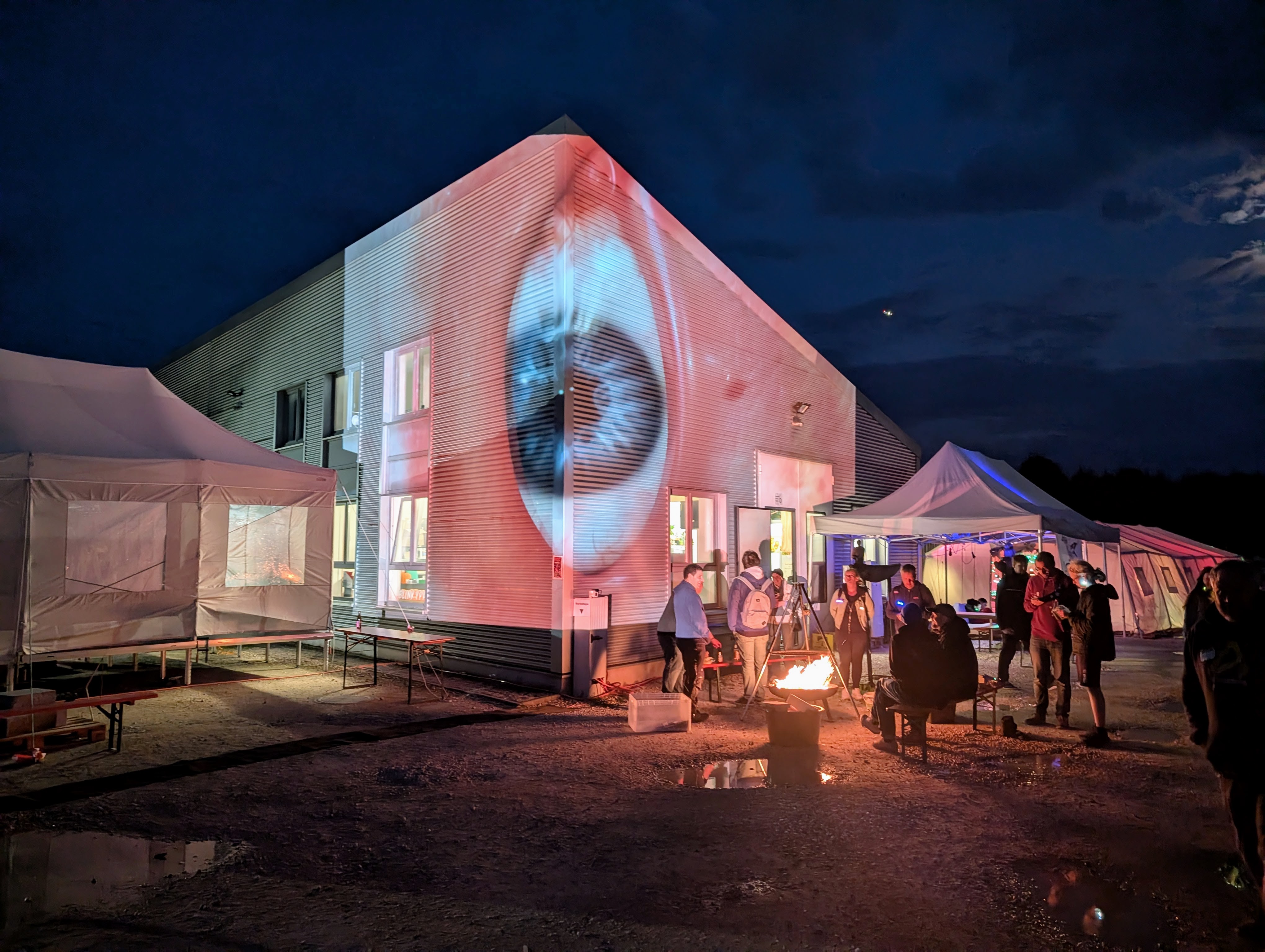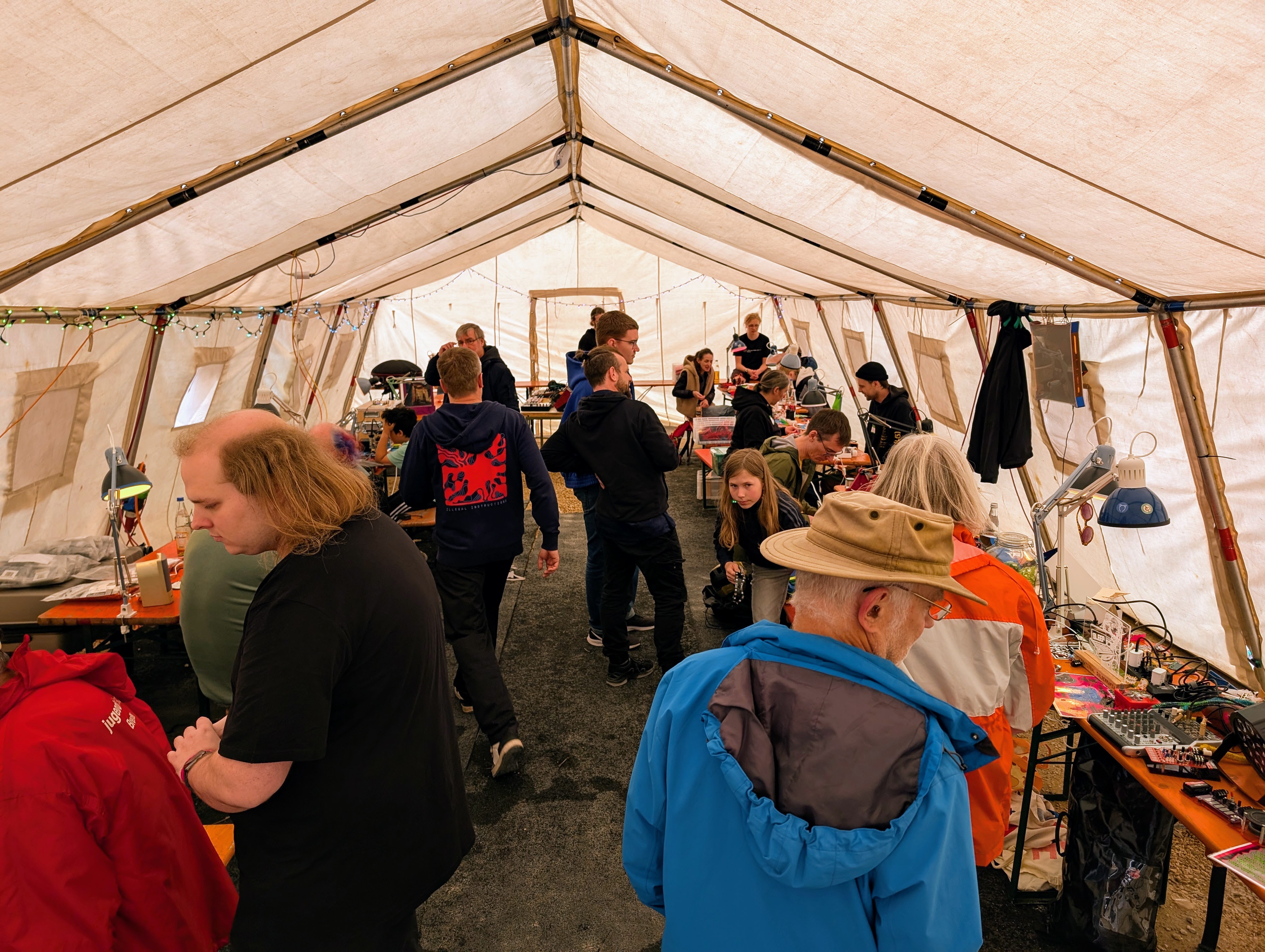 Vier Tage Makerspace auf Industrieareal: große Flächen, getrennte Werkstatt-Zonen, Ausstattung und Basisversorgung – damit du dich auf Projekte und Austausch konzentrieren kannst.